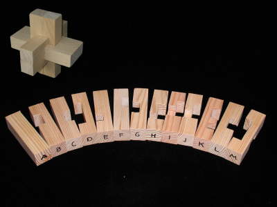 Aus den 13 Teilen lassen sich insgesamt 40 verschiedene Teufelsknoten zusammensetzen. Wahrscheinlich haben schon viele diese sechs kleinen, selbstgefertigten Holzstäbe Größe:1,5x1,5x4,5 cm zum Teufel gewünscht, die – geschickt ineinander gesteckt – einen Holzknoten bilden.